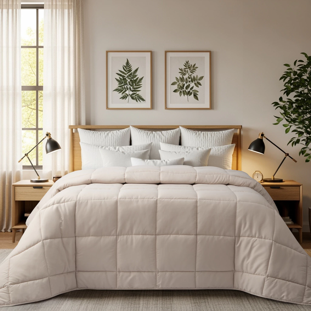 Sumérgete en la calidez y suavidad de un acolchado hotelero diseñado para brindar máximo confort a tus noches. Su acabado de microfibra brusheada ofrece una textura increíblemente suave, mientras su relleno símil plumón te envuelve en un abrigo ligero pero cálido.