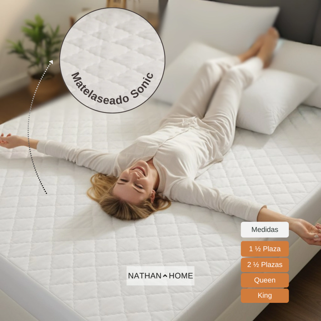 Protegé tu descanso con el cubrecolchón impermeable de Nathan Home, confeccionado en microfibra premium con matelaseado sonic, que asegura frescura, suavidad y máxima protección para tu colchón todos los días.