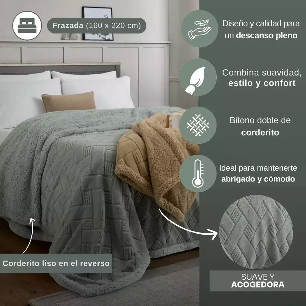 • Diseño: Bitono doble con jacquard en un lado y corderito liso en el reverso, ofreciendo una textura suave y cálida.