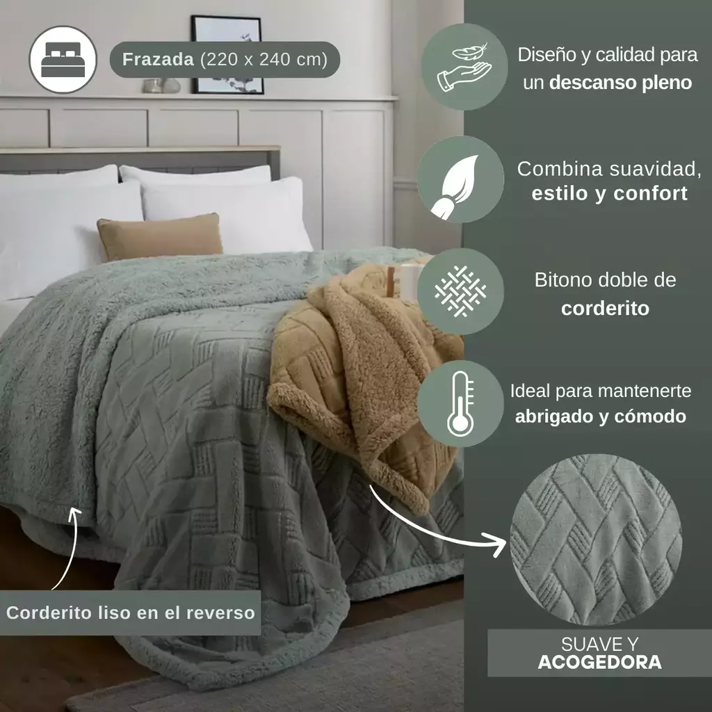 Envuélvete en el lujo y confort de la frazada bitono doble de corderito jacquard con reverso de corderito liso. Perfecta para camas 2 1/2 plazas, brindando suavidad, calidez y un toque de estilo único.