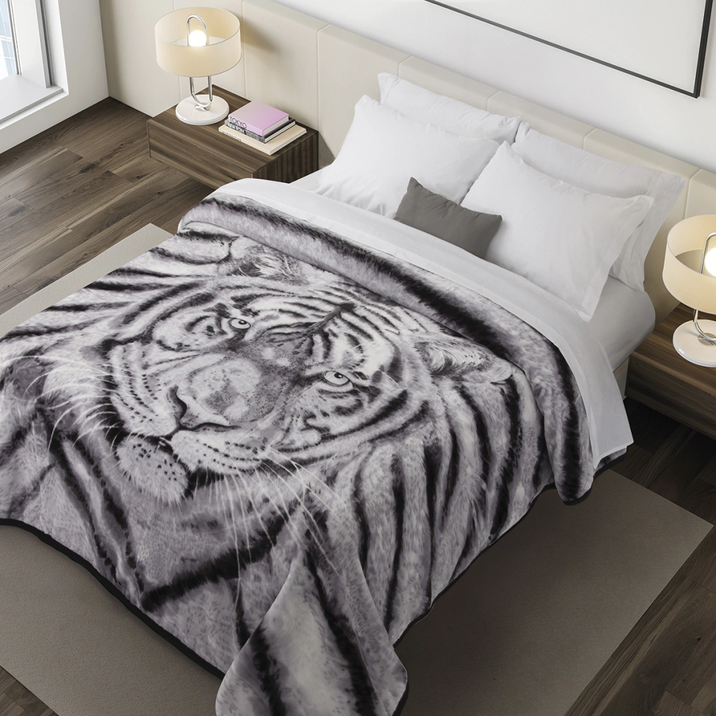 Disfruta de la suavidad y calidez de esta frazada de piel doble pesada estampada, diseñada para brindarte el máximo confort y elegancia en tu cama.