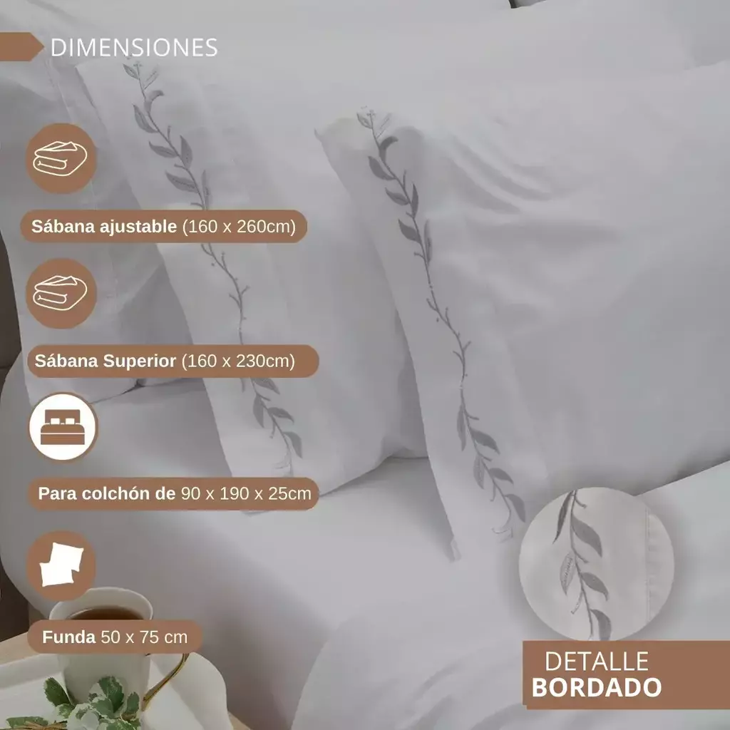 Descubre el confort y la elegancia con el Juego de Sábanas de 1 1/2 Plazas de la Línea 600 HQ Brodery de Alcoyana. Este conjunto está pensado para ofrecerte una experiencia de descanso inigualable.