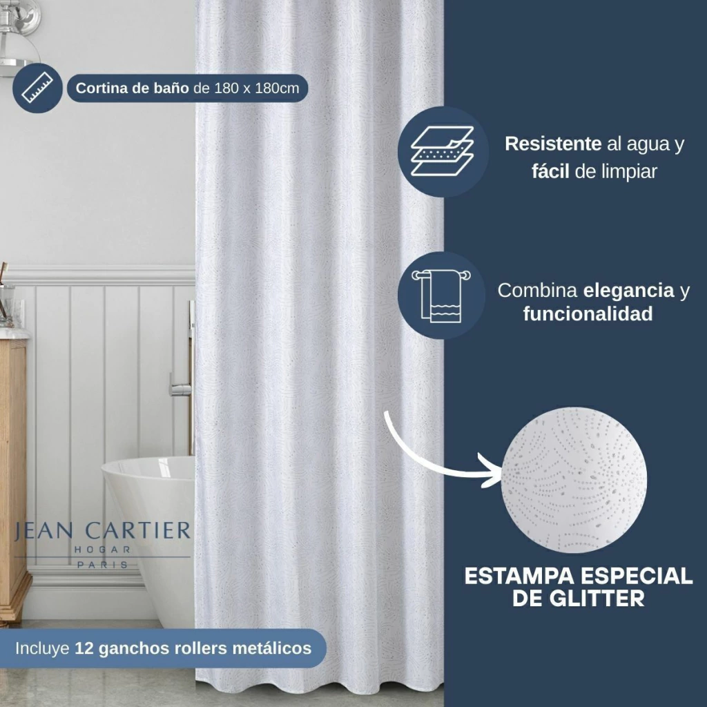 Dale un aire lujoso a tu baño con el Set de Baño Luxury de Jean Cartier. Su cortina con efecto brillo no solo embellece tu espacio, sino que también brinda protección y facilidad en el mantenimiento. ¡Haz de tu baño un lugar especial y acogedor!