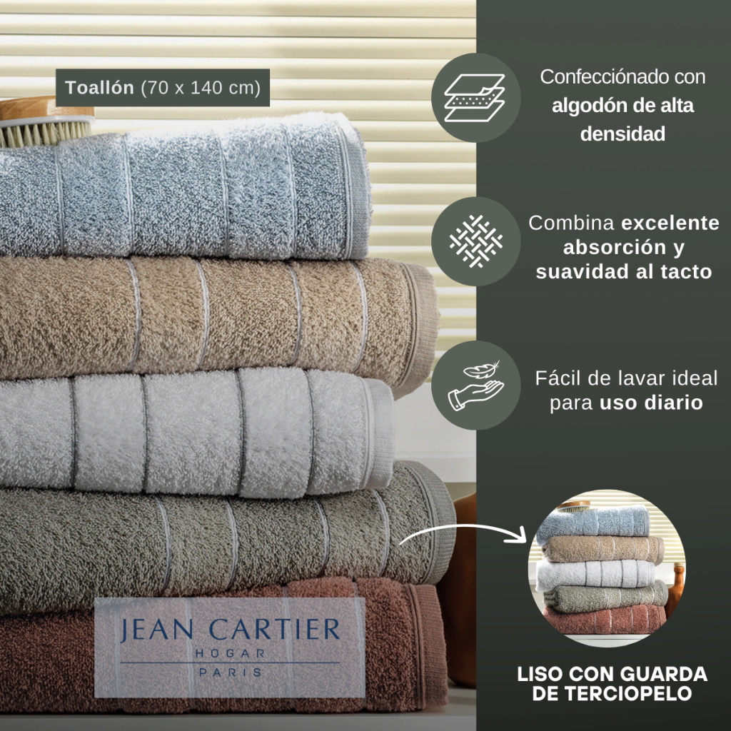 ¡Transforma tu baño con el lujo del Toallón Liso con Guarda de Terciopelo, Efecto Velour! ¡Haz tu compra ahora y disfruta de la suavidad y calidad premium de Jean Cartier!